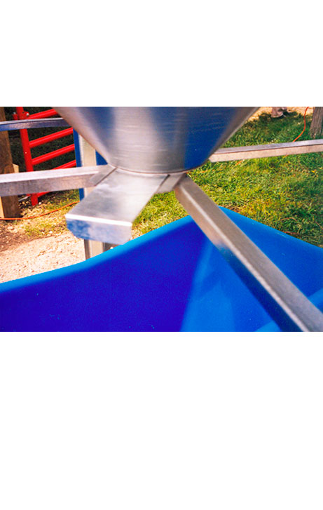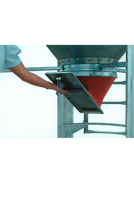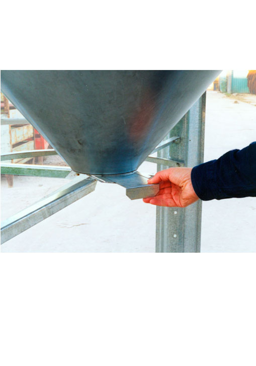 Come with a slide gate for feed discharge at the bottom of the cone (see above). These bins cannot be used with rigid or flex auger.